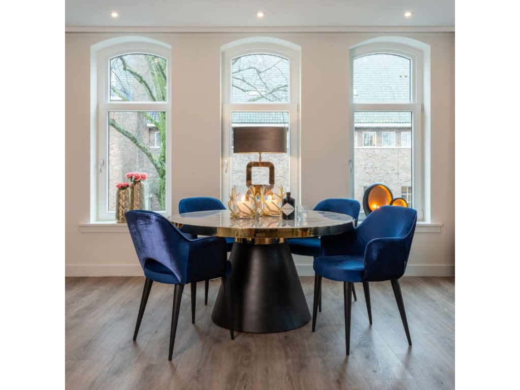 Kulatý jídelní stůl Odin od značky Richmond Interiors si zamilujete díky jeho elegantnímu zpracování. Bílá mramorová deska a černá kovová podnož ve tvaru kuželu vytváří atraktivní kombinaci, díky níž stůl získává na šarmu a osobitosti. Příjemný designový prvek pak tvoří zlatý okraj desky stolu. Tento stylový kousek vynikne v klasických i moderních jídelnách.