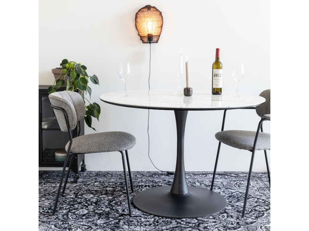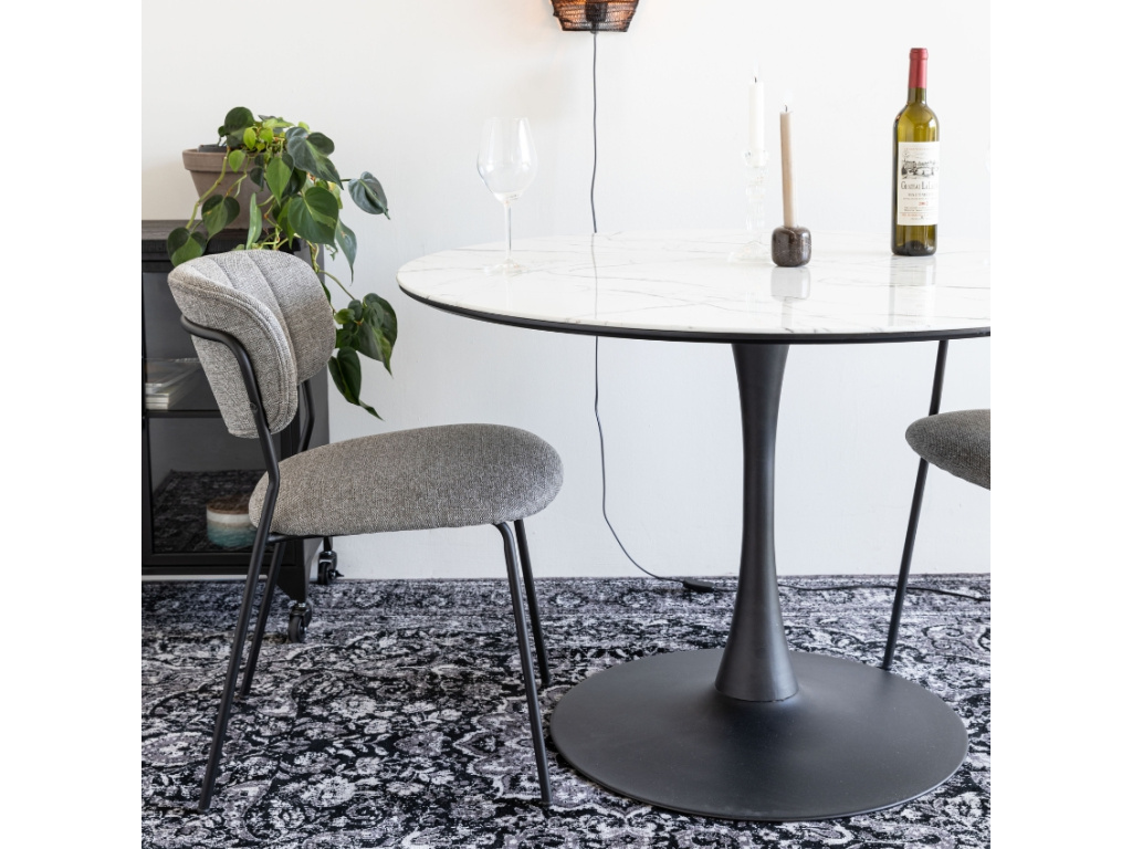 Kulatý jídelní stůl MARU značky WHITE LABEL LIVING vás nadchne dekorem své desky. Ten připomíná mramor atraktivního bílého zbarvení. Tato mramorová folie dodá vaší jídelně nádech luxusu a elegance. Stůl stojí na elegantně tvarované kovové podnoži s kruhovou základnou a pohodlně se k němu vejdou 4 strávníci. Skvěle se k němu hodí čalouněné jídelní židle, slušet mu to například v kombinaci se světle šedou barvou.