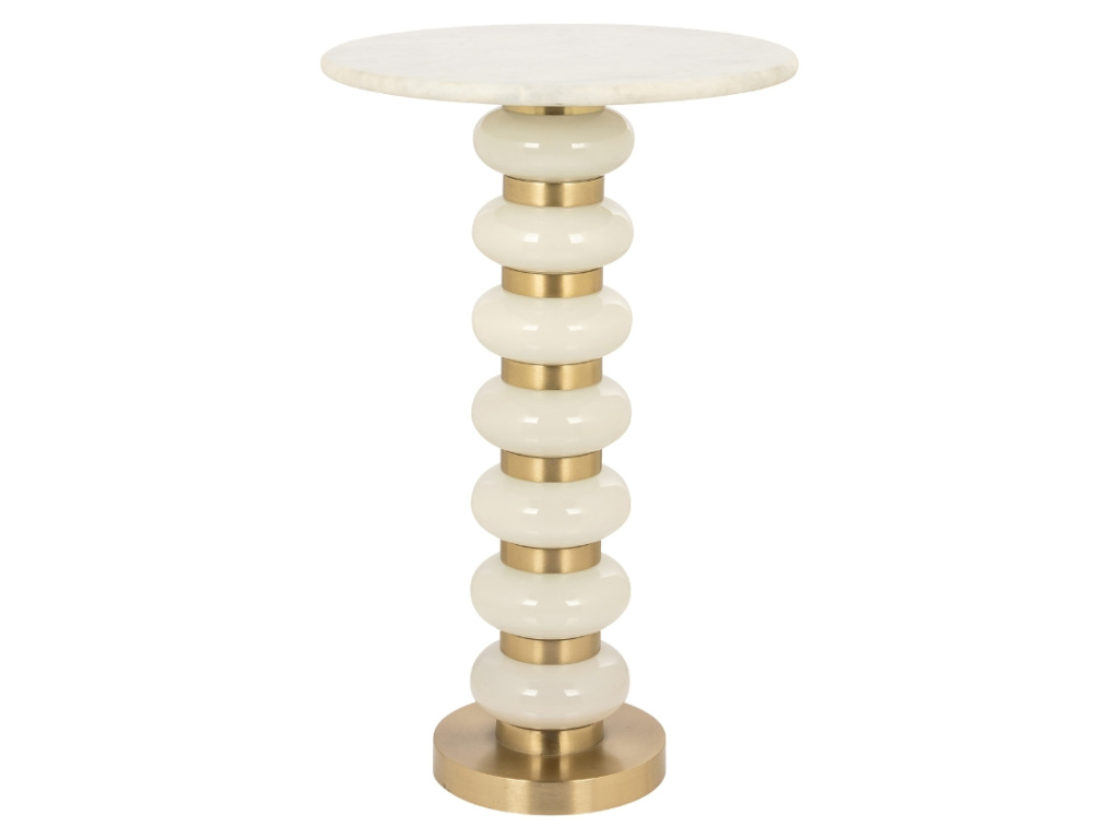Nevšední odkládací stolek Barbara od značky Richmond působí díky mramorové desce a zlacenému hliníku okázalým dojmem, který do vašeho interiéru vnese nádech luxusu. Hliníkové pruhy tvořící podnož jsou prokládány oblými díly z bílého neprůhledného skla a vytvářejí tak zajímavý efekt připomínající navlečené korálky. Stolek se bude skvěle kombinovat se zlatými doplňky. Umístit jej můžete vedle pohovky jako prostor na odložení kávy nebo jej použít jako podstavec pro vystavení dekorací a květin.