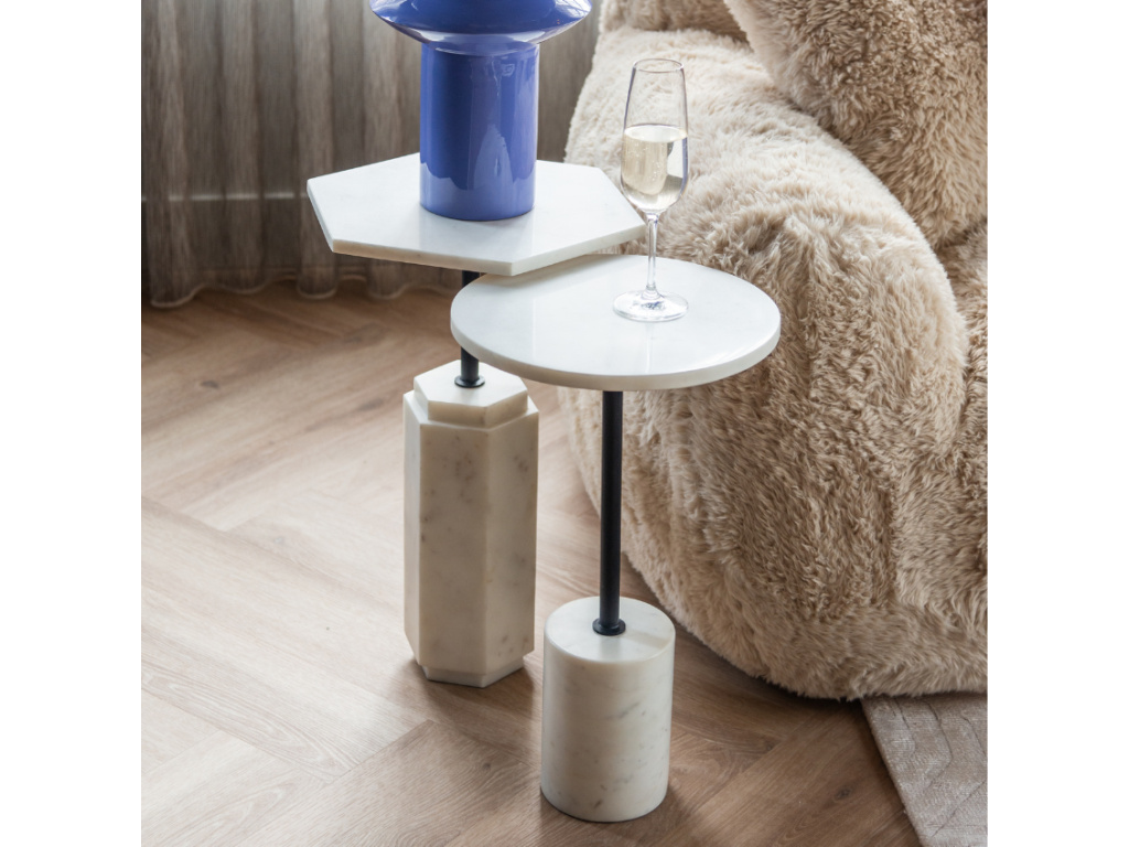 Odkládací stolek Misty od značky Richmond přinese do každé domácnosti dotek mramorové elegance s nádechem luxusu. Kulatá mramorová deska o průměru 30 cm se skvěle hodí pro odložení základních předmětů, ale i dekorativních prvků. Kombinace bílého mramoru a černého kovu vytváří všestranný a univerzální vzhled, který doplní širokou škálu interiérových stylů – od moderních, minimalistických, až po industriální.