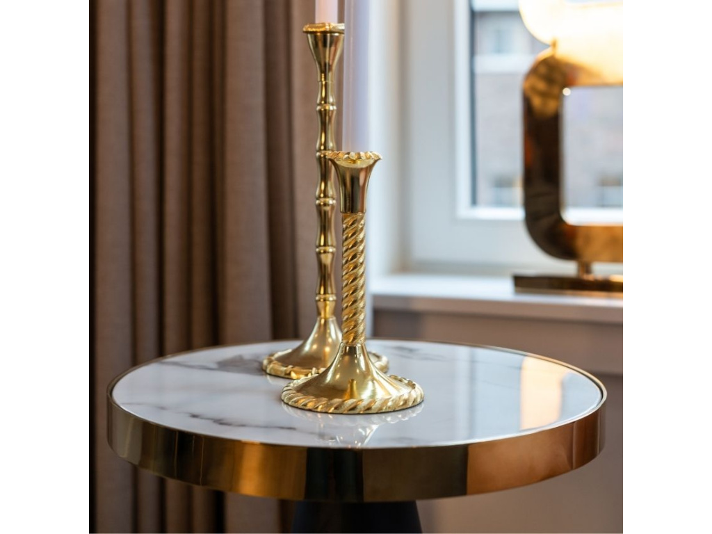 Kulatý odkládací stolek Odin od značky Richmond Interiors si zamilujete díky jeho elegantnímu zpracování. Bílá mramorová deska a černá kovová podnož ve tvaru kuželu vytváří atraktivní kombinaci, díky níž stolek získává na šarmu a osobitosti. Příjemný designový prvek pak tvoří zlatý okraj desky stolu. Tento stylový kousek vynikne v klasických i moderních interiérech.