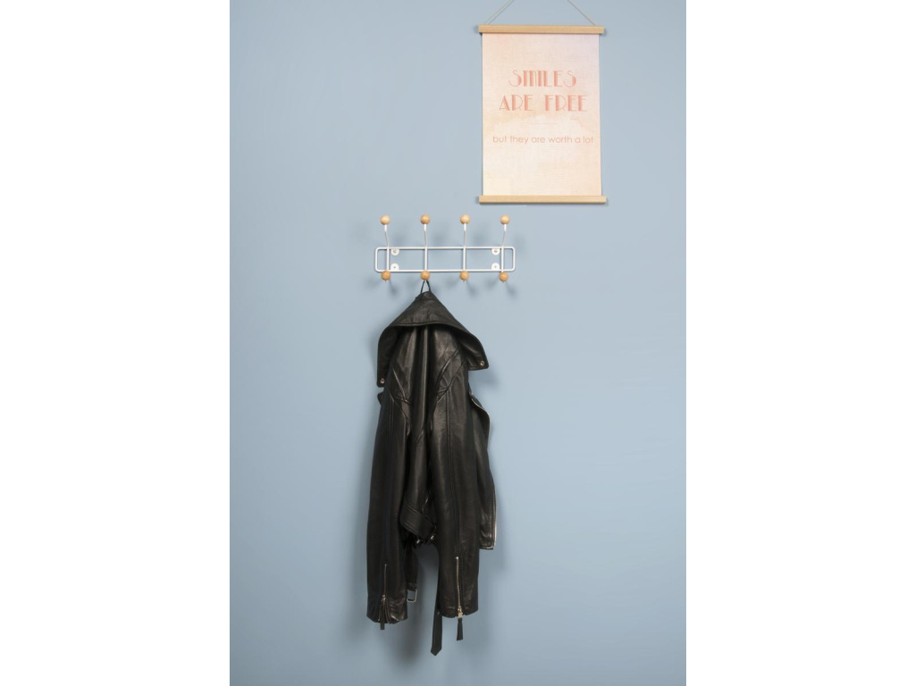 Designový nástěnný věšák Arfus II. v bílém provedení, kde jsou na místo klasických háčků použity dřevěné kuličky. Díky několika barevným kombinacím je široká možnost umístění. Například do předsíně, ložnice, haly i dětského pokoje.