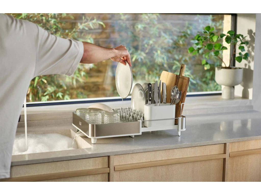 Praktický odkapávač Extend Steel od Joseph Joseph bude nepostradatelným pomocníkem při ručním mytí nádobí. Odkapávač je rozšiřovatelný a v případě potřeby umožňuje snadné zvětšení odkapávací plochy na téměř dvojnásobek původní velikosti. Disponuje také odtokovým uzávěrem s otočnou hubičkou, kterou nasměrujete do dřezu a vypustíte přebytečnou vodu. Ocelové držáky jsou zakončeny hroty s ochrannou proti poškrábání, proto jsou vhodné pro všechny druhy nádobí včetně sklenic. Nádoba na příbory je odnímatelná. Odkapávač má také protiskluzné nožky, zajišťující jeho stabilitu na pracovní desce.