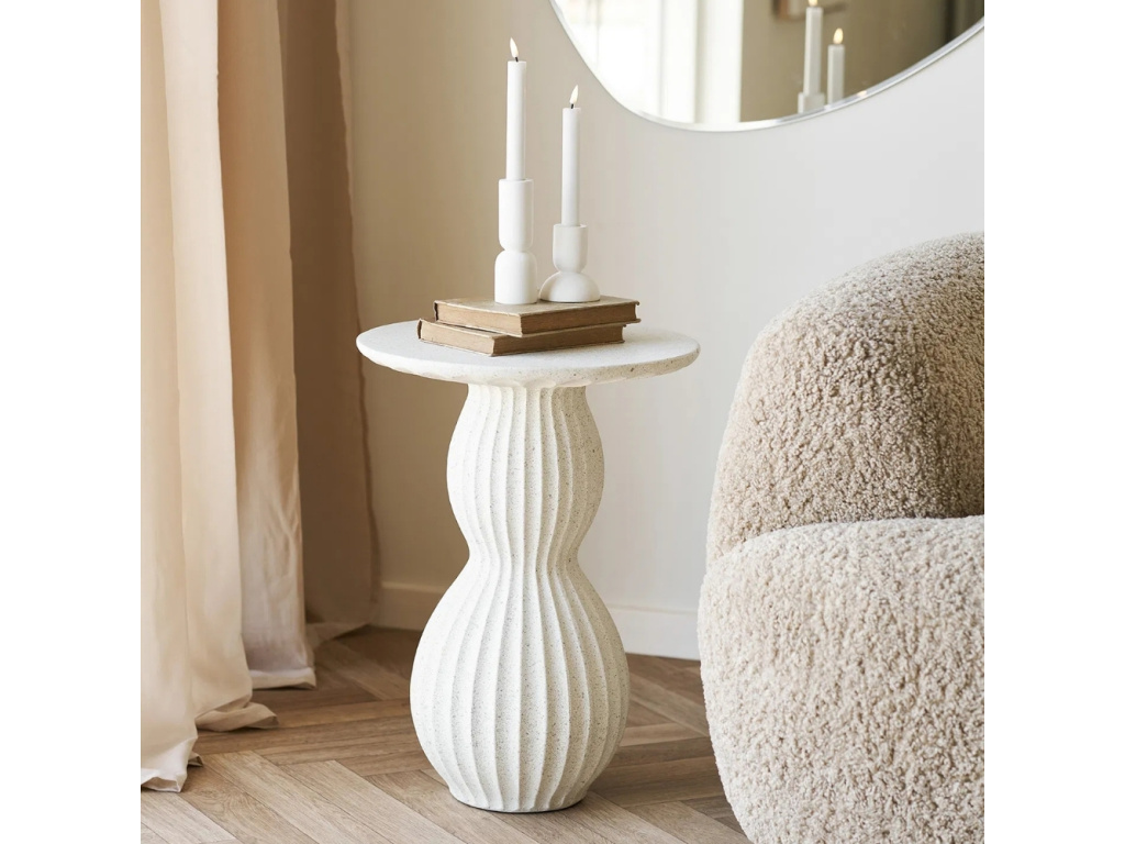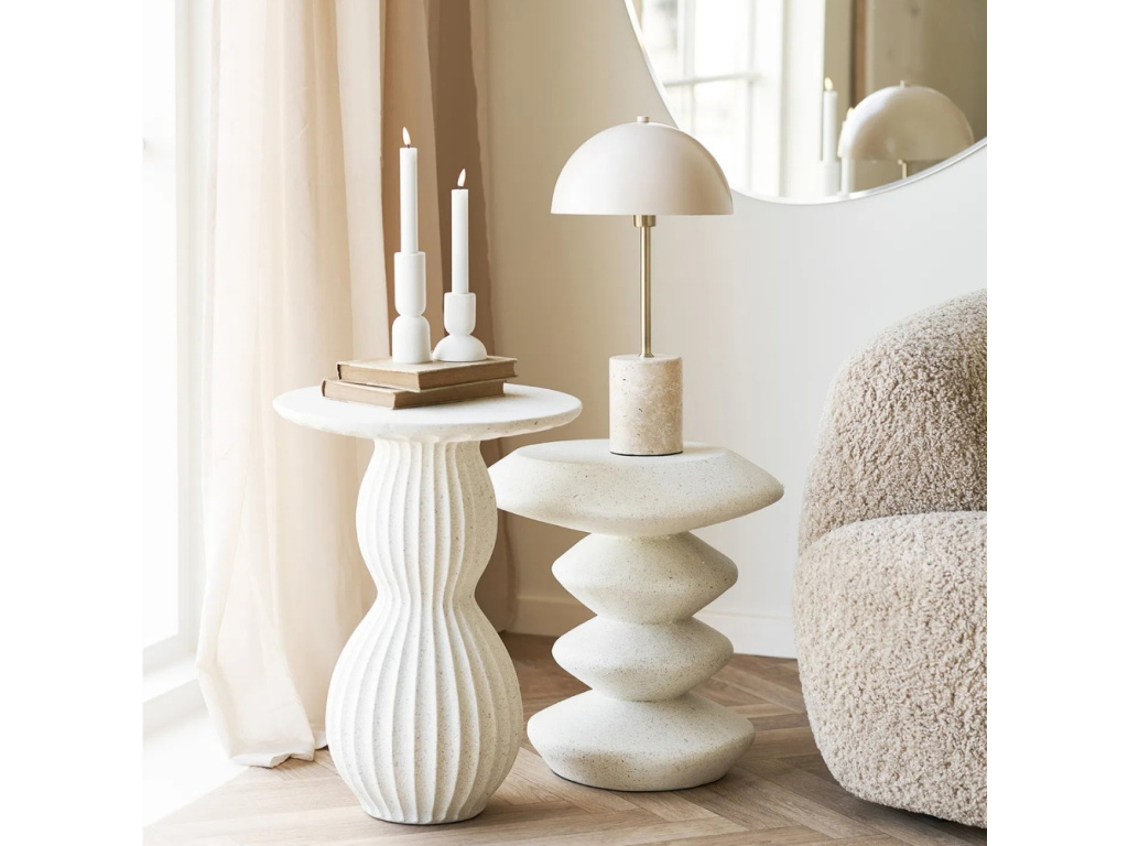 Odkládací stolek Newton v bílé barvě zaujme svým elegantním tvarem inspirovaným sochařskými liniemi, které do interiéru vnesou jemnost a styl. Propracované křivky vytvoří zajímavou hru světla a stínu, čímž stolek působí jako výjimečný designový prvek. Jemný povrch dodá prostoru vzdušnost a čistotu, zatímco jeho tvar přirozeně upoutá pozornost. Díky vyváženým proporcím skvěle vynikne samostatně, ale také snadno zapadne do moderního, skandinávského či minimalistického stylu a podpoří tak harmonický vzhled interiéru. Praktická deska poskytne prostor pro dekorace, knihu nebo šálek kávy a vytvoří ideální místo pro chvíle odpočinku. Ať už jej umístíte do obývacího pokoje, ložnice či na terasu, dodá prostoru moderní a přitom nadčasový charakter.