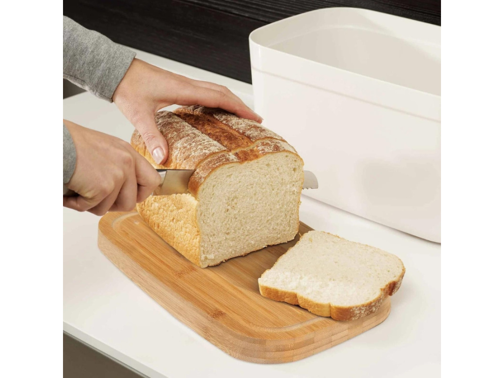 Chlebník s krájecím prkénkem Bread Bin nesmí chybět v žádné praktické domácnosti! Jeho korpus je vyrobený z odolného a snadno čistitelného polypropylenu. Krájecí prkénko, které zároveň slouží jako víko, je vyrobeno z bambusového dřeva. Z vrchní strany je v prkénku úchyt pro snadnou manipulaci, ze spodní strany drážky na zachycení drobečků z pečiva. Korpus má na spodní straně také protiskluzné nožky. Chlebník v jednoduchém designu je k dostání i v černé barvě.