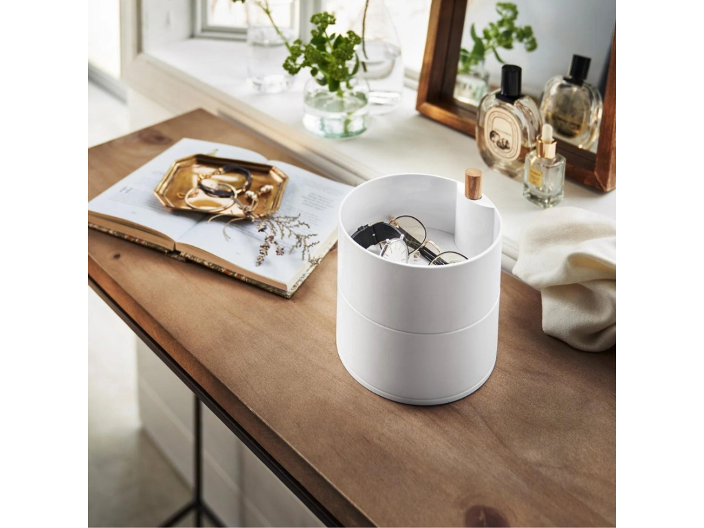 Otočný organizér na šperky Tosca od značky Yamazaki je ideálním řešením pro uspořádání vašich šperků a dalších drobností. Tento elegantní organizér kombinuje odolný ABS plast s jasanovým dřevem a díky svému čistému vzhledu snadno zapadne do minimalistických, moderních, ale i industriálních interiérů. Otočný mechanismus misek umožňuje snadný přístup ke šperkům, což usnadňuje jejich organizaci a zabraňuje zamotání. Dvoupatrový organizér je možné využít nejen na šperky, ale i na další drobnosti, jako jsou klíče, hodinky nebo kosmetické potřeby.