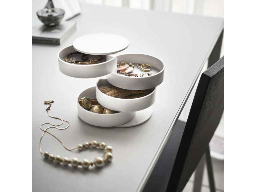 Otočný organizér na šperky Tower od značky Yamazaki je ideálním řešením pro uspořádání vašich šperků a dalších drobností. Tento elegantní organizér je vyroben z ABS plastu a díky svému minimalistickému vzhledu se hodí do různých stylů interiérů. Otočný mechanismus misek umožňuje snadný přístup ke šperkům, což usnadňuje jejich organizaci a zabraňuje zamotání. Čtyřpatrový organizér je možné využít nejen na šperky, ale i na další drobnosti, jako jsou klíče, hodinky nebo kosmetické potřeby.