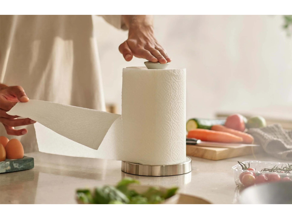 Stojan na role papírových utěrek Push&Tear disponuje pružinovou hlavicí, jejímž stiskem zablokujete otáčení role při odtrhávání. Máte-li špinavé ruce, umožňuje nerezová hlavice i stisk zápěstím nebo předloktím. Zvednutý okraj základny stojanu zabraňuje samovolnému odvíjení papíru. Spodní strana stojanu má protiskluzovou úpravu. Nové role se nasazují po vyjmutí hlavice. Stojan je vhodný pro papírové role do výšky 24 cm.