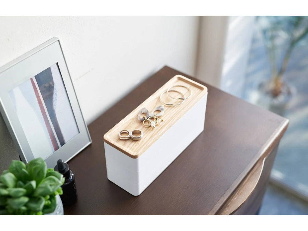 Třípatrový úložný box Rin od značky Yamazaki je stylový a praktický organizér určený pro uložení různých drobných předmětů. Rin disponuje dřevěným víkem a je vyrobený z odolného ABS plastu, který zajišťuje dlouhou životnost a snadnou údržbu. Tři oddělené úložné prostory umožňují efektivní roztřídění a snadný přístup k uloženým předmětům. Rin je ideální pro různé použití, jako je uložení kancelářských potřeb, kosmetiky, šperků nebo jiných drobností.