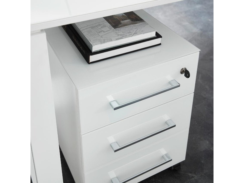 Moderní kancelářský kontejner Monteria od značky GERMANIA je perfektním kouskem do vaší kanceláře. Jednoduchá, bílá barva laminátového korpusu ve vysokém lesku vytváří jemný a čistý vzhled, který do vašeho interiéru vnese nádech minimalistického designu. Přední stranu zdobí tvrzené sklo. Prostorné úložiště zajišťují 3 zásuvky, díky čemuž pohodlně uložíte velké množství všeho inventáře. Celý design podtrhnou 3 kovové úchytky v chromované barvě. Povrchová úprava korpusu z melaminové pryskyřice poskytuje nárazuvzdorný a vlhkosti odolný povrch. Příjemným bonusem je možnost kontejner uzamknout a ochránit tak vaše důležité dokumenty. Díky nárazuvzdorným ABS hranám máte vyšší jistotu odolnosti, díky čemuž se skvěle hodí nejen do komerčních prostor, ale také do domácích pracoven. Doporučujeme kombinace všech produktů z řady Monteria.