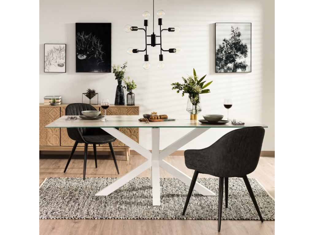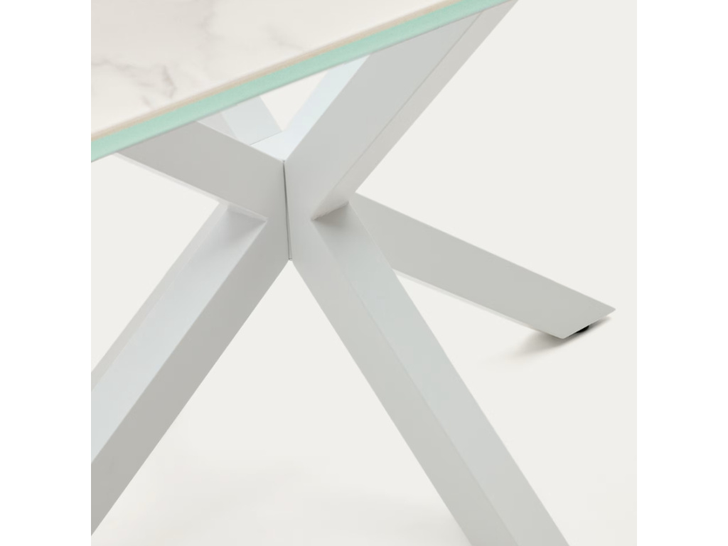 Krásný a nadčasový jídelní stůl Kave Home Argo se pyšní svým originálním a propracovaným designem. Jeho bílá ocelová podnož ve tvaru hvězdy zajišťuje perfektní stabilitu a navíc každého na první pohled zaujme. Elegantní bílá porcelánová deska s dekorem mramoru se s podnoží skvěle doplňuje. Jídelní stůl se bude vyjímat zejména v minimalistických interiérech.