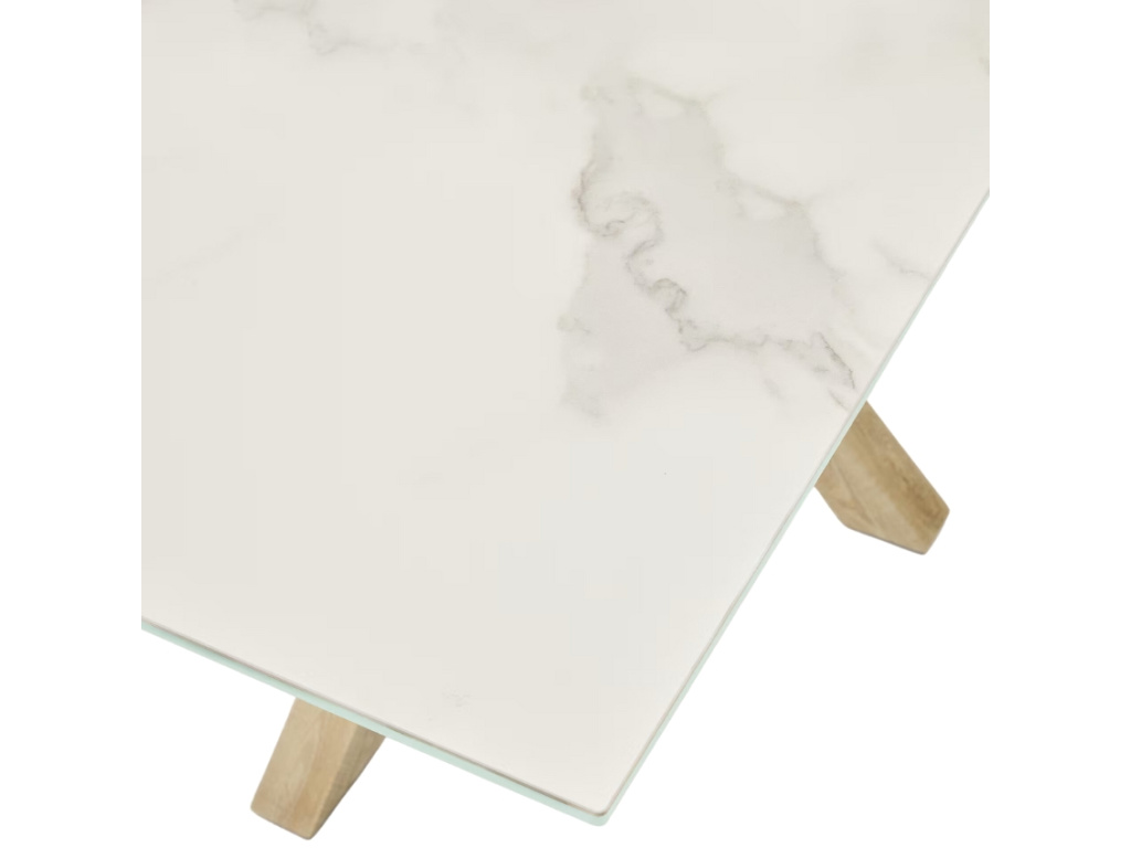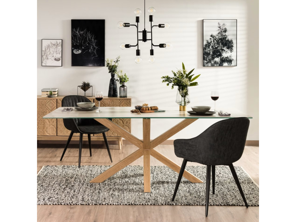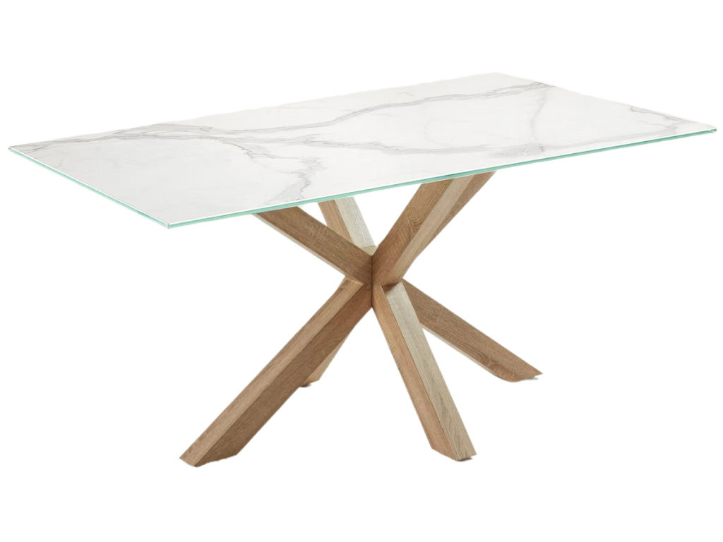 Jídelní stůl Kave Home Argo se pyšní svým propracovaným a nadčasovým designem. Jeho ocelová podnož v dekoru přírodního dřeva připomínající hvězdu zajišťuje perfektní stabilitu a navíc každého na první pohled zaujme. Bílá porcelánová deska s mramorovým dekorem je velmi elegantní a s podnoží se příjemně doplňuje. Stůl se bude vyjímat zejména v minimalistických a skandinávských interiérech.