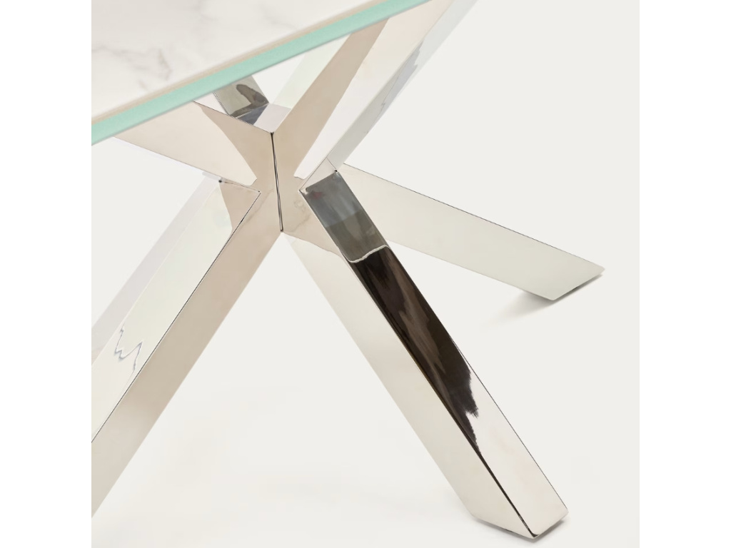 Krásný a nadčasový jídelní stůl Kave Home Argo vás na první pohled zaujme svým originálním a propracovaným designem. Jeho podnož je vyrobena z nerezové oceli a má zajímavý tvar připomínající hvězdu. Zajišťuje perfektní stabilitu a navíc každého na první pohled zaujme. Elegantní bílá porcelánová deska se s podnoží skvěle doplňuje. Tento jídelní stůl se bude vyjímat zejména v minimalistických interiérech a díky svým rozměrům je skvělou volbou i pro početnější rodiny.