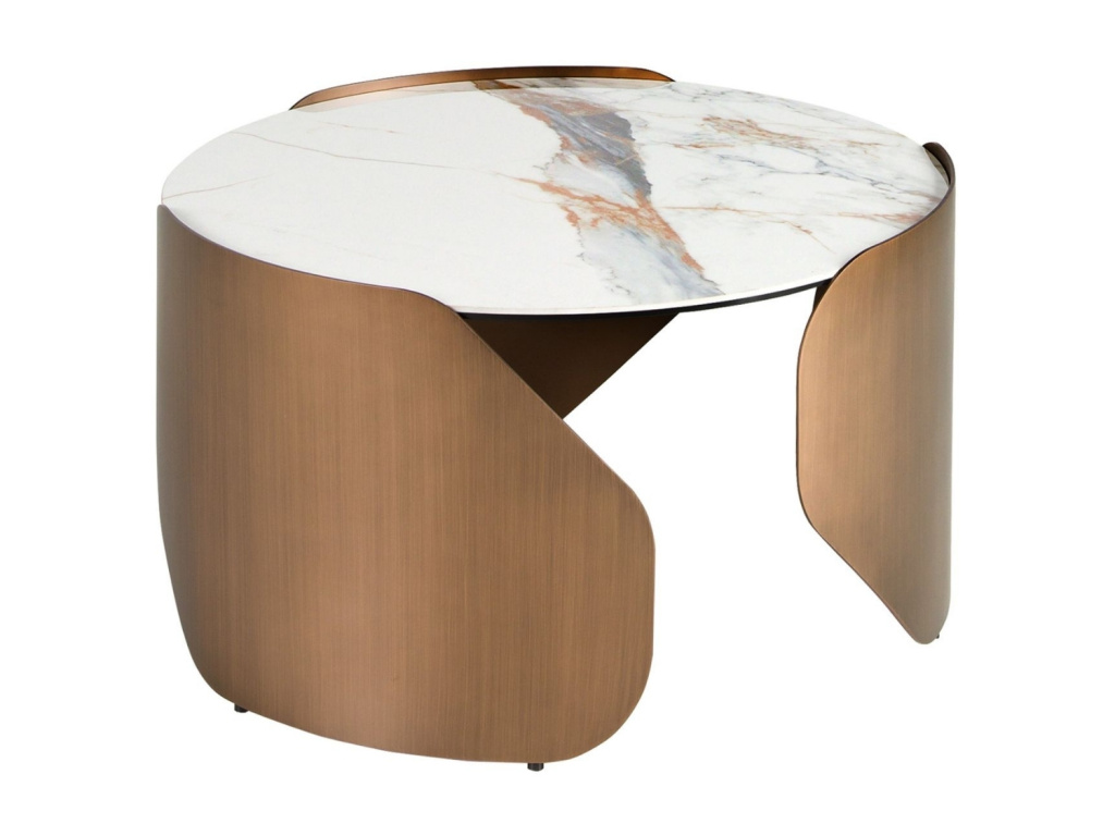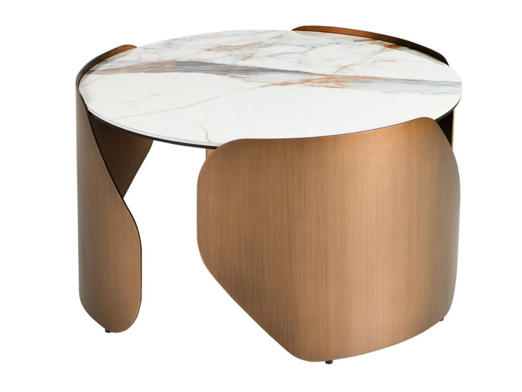 Moderní kulatý konferenční stolek Angel Cerdá je drobným, ale výrazným designovým akcentem, který přirozeně doplní každý elegantní interiér. Bílá porcelánová deska s mramorovým dekorem s jemným šedým a oxidovým žilkováním zaujme lesklou povrchovou úpravou a dodá prostoru lehký nádech luxusu. Originálně tvarovaná podnož z bronzové nerezové oceli vytváří kontrast k světlé desce a současně zajišťuje stabilní a pevnou konstrukci. Zaoblené linie stolku působí měkce a vyváženě, díky čemuž se snadno začlení do moderních, minimalistických i elegantně laděných obývacích pokojů.