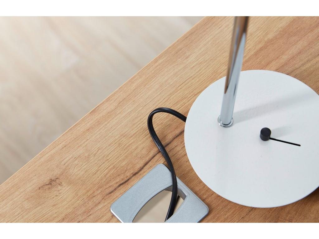 Moderní pracovní stůl Lioni je inspirován severským stylem. Kombinace bíle lakované kovové podnože a desky v dekoru přírodního dubového dřeva působí elegantním skandinávským stylem, který se hodí do světlých a moderních interiérů.
