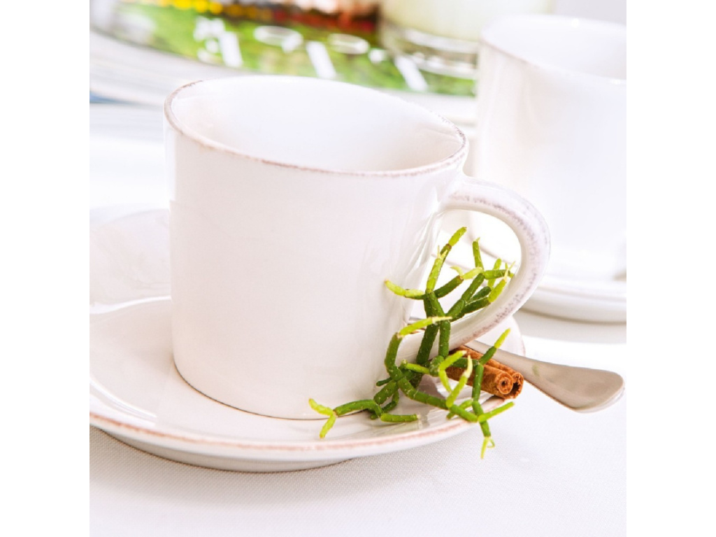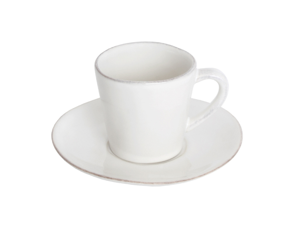 Kameninový šálek s podšálkem je bíle glazovaný s jemným pískovým okrajem. Retro vzhled kompletu působí decentně i přestože má výrazné logo značky. Nepravidelný lem talířku působí přírodně a zároveň starožitně.