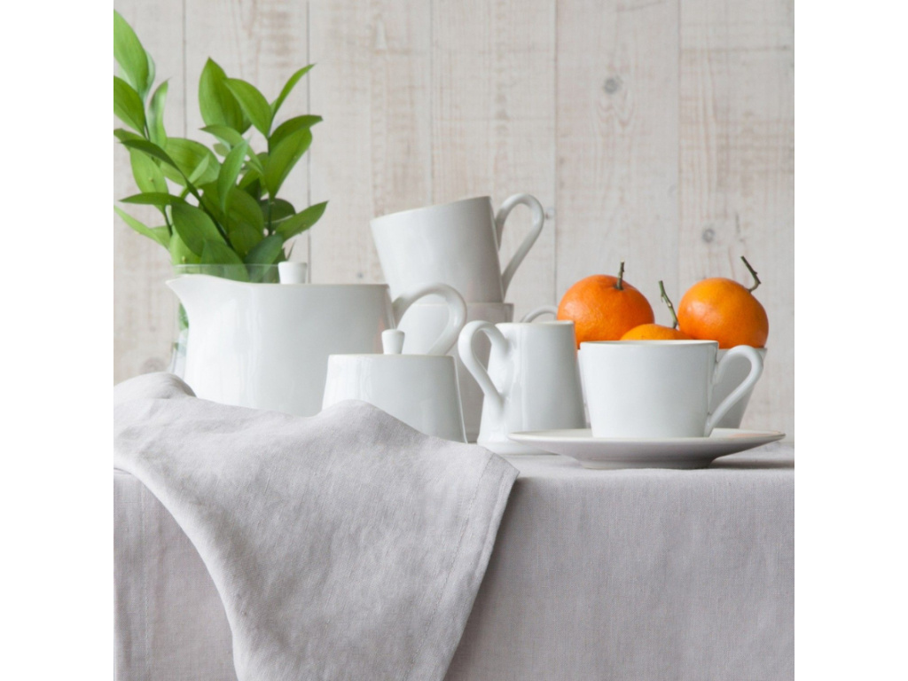 Kameninový šálek s podšálkem působí velmi svěžím dojmem. Tradiční bílá barva je jemně doplněna pískovými okraji šálku i talířku. Netradiční tvar hrnečku velmi elegantně doplňuje oblé ouško a tím celý komplet zjemňuje.