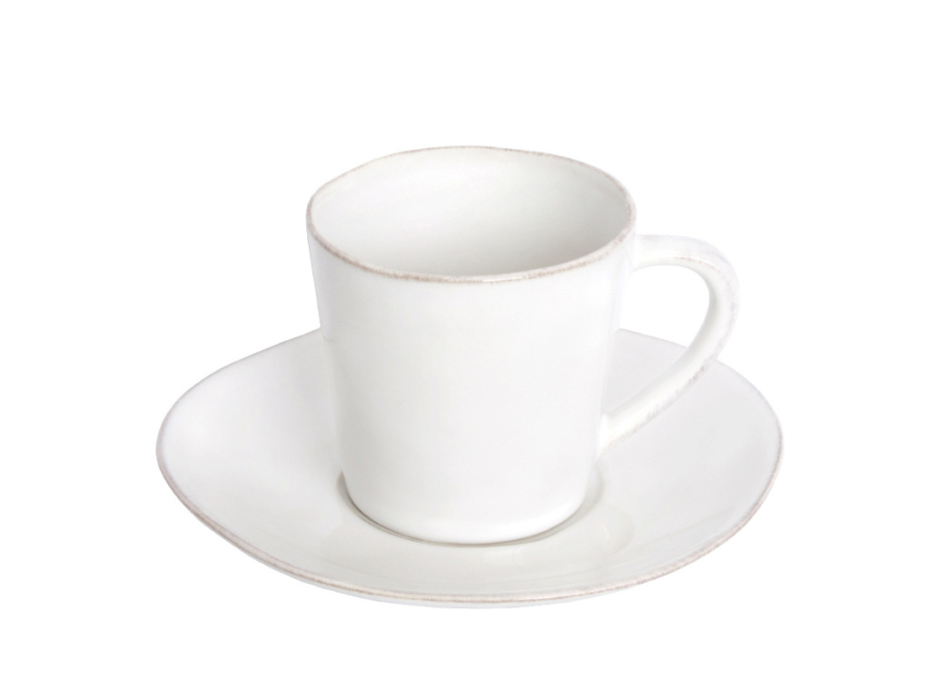 Bílý kameninový šálek je ideální pro vychutnání si ranní kávy. Lesklá glazura společně s podšálkem vytváří starožitný vzhled. Šálek má vhodnou velikost pro espresso.