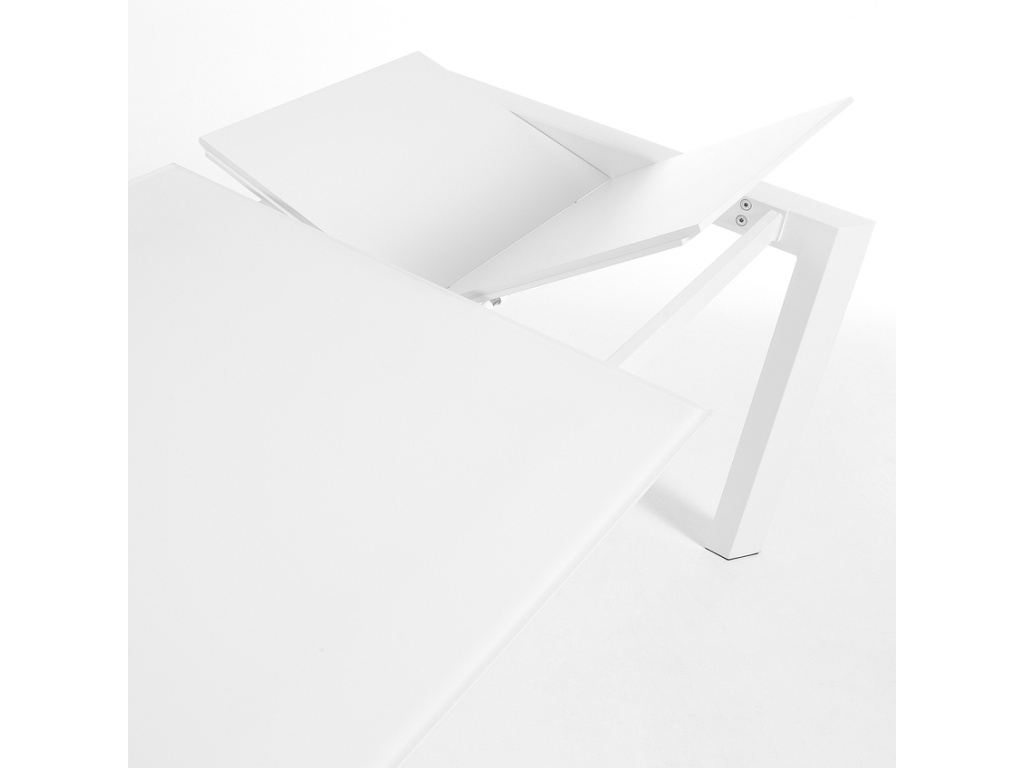 Stylový jídelní stůl Kave Home Axis zaujme nejen svým jedinečným designem, ale také jeho praktickou stránkou – během chvilky ho snadno rozložíte a získáte tak místo i pro početnější návštěvy. Deska je vyrobena z tvrzeného skla a vytváří tak elegantní a designový celek, který se jen tak nevidí. Rozkládací část z lakované MDF desky je ukryta v konstrukci stolu, takže se nemusíte bát, že pro ni nebudete mít doma místo. Podnož z bíle lakované oceli má zajímavě zkosené hrany a to dodává stolu na atraktivitě. Pokud hledáte stůl s nadčasovým minimalistickým designem, u kterého si budete každý den užívat společné rodinné chvilky, Axis bude skvělou volbou.