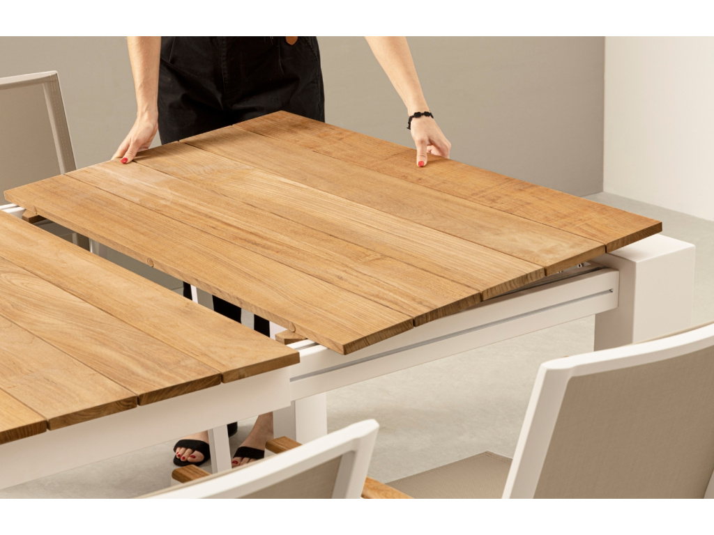 Velký rozkládací jídelní stůl Cameron od italské značky Bizzotto je připraven pohostit vaše přátelé i rodinu. Pevný základ z práškově lakovaného hliníku a kvalitní deska z masivního teakového dřeva jsou skvělou nadčasovou kombinací, díky které bude jídelní stůl chloubou vaší zahrady či terasy. Stůl lze dle potřeb roztáhnout pomocí teleskopického otvírání a vytvořit tak prostor až pro 12 osob. Dřevěný nástavec najdete prakticky skrytý pod vrchní deskou. Moderní venkovní stůl Cameron nabízíme ve dvou barevných provedeních a třech velikostech.