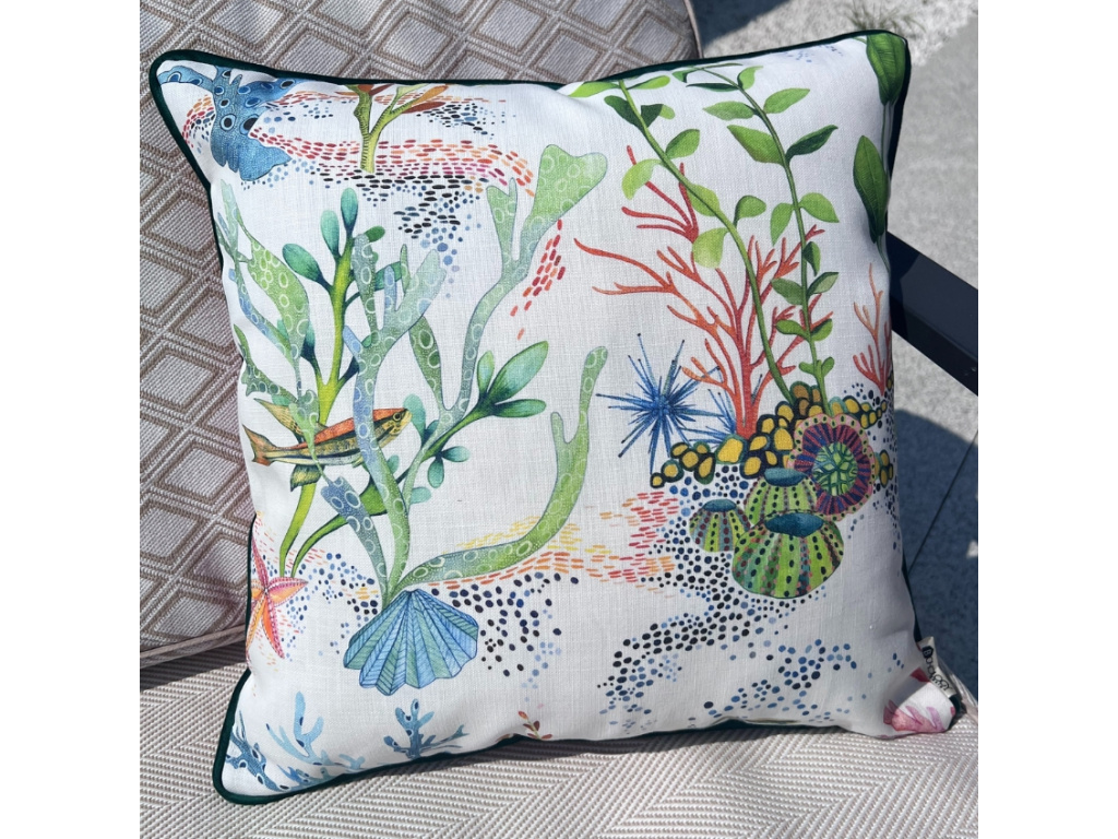 Povlak na polštář Marine od české značky BOHOLOGY zaujme na první pohled originálním motivem podmořského světa. Je ušitý z kvalitních anglických látek Osborne&Little, které vznikají pod rukama světových návrhářů. Tyto látky jsou vhodné do interiéru i exteriéru, kde snesou i náhlý letní déšť. Druhá strana povlaku je jednobarevná, takže pokud zatoužíte po změně, můžete polštář kdykoliv otočit a vzor tak na chvíli skrýt. Po straně se ukrývá zip, díky čemuž lze povlak jednoduše sundat a vyprat. Marine se rychle stane vaším oblíbeným společníkem při venkovním posezení, které si můžete libovolně nakombinovat spolu s dalšími povlaky z této řady.