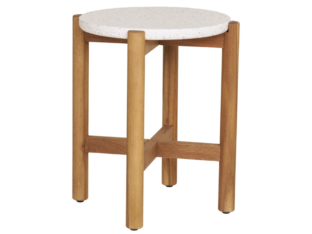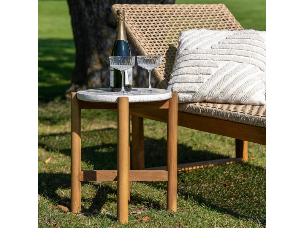 Zahradní odkládací stolek Terracina značky Nordic Living skvěle doplní vaše venkovní posezení. Přinese pod vaši pergolu praktické místo k odkládaní drobností nebo k naaranžování květin a dekorací. Stylové propojení odolného akátového dřeva a desky z bílého terazza dodává stolku atraktivní vzhled a dlouhou životnost. Doplňte s jeho pomocí zahradní křeslo či pohovku a vytvořte si tak útulné místo pro odpočinek.