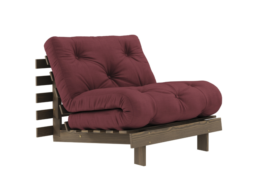 Rozkládací křeslo Roots od značky Karup Design se rychle stane vaším oblíbeným společníkem při chvilkách odpočinku. Elegantní a stylové křeslo proměníte jednoduchým pohybem na praktické a pohodlné lůžko. Konstrukce z hnědého masivního borovicového dřeva s FSC certifikací je doplněna kvalitní 12 cm vysokou futonovou matrací, která v sobě kombinuje recyklovaná vlákna a 4 cm pěnu. Křeslo Roots skvěle doplní skandinávsky a minimalisticky laděné domovy. Ideální je například pro menší interiéry, kde oceníte další místo na spaní. Vybrat si ho můžete v široké škále barev.