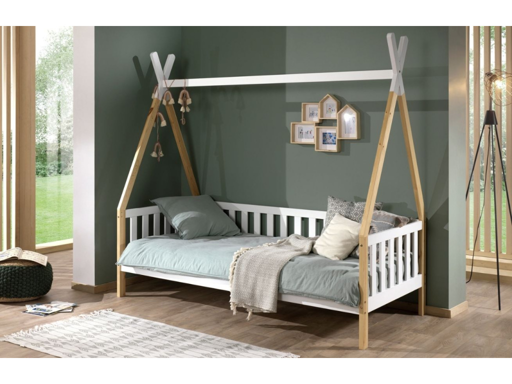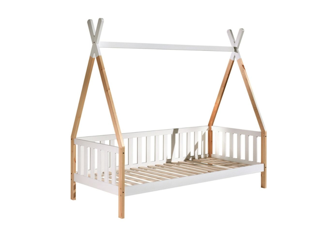 Postel Vipack Tipi je vyrobena z masivního borovicového dřeva z šetrně obhospodařovaných lesů. Kombinaci přírodní a bílé barvy vypadá skvěle a navíc vnese do dětského pokoje moderní a svěží nádech. Postel svou vysokou konstrukcí připomíná stan. Stačí přes ni přehodit deku nebo prostěradlo a z postele se rázem stane báječný bunkr, se kterým si děti užijí spoustu zábavy.