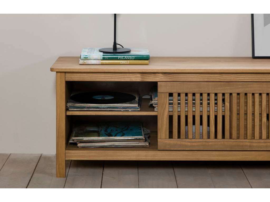 Televizní stolek Bruna od značky Marckeric vyrobený z masivního borovicového dřeva se stane jedinečným a stylovým doplňkem vašeho obývacího pokoje. Obdélníkový lakovaný korpus z masivního dřeva v přírodním odstínu nabízí prostorný úložný prostor díky 2 zásuvkám a uzavřeným policím s posuvnými dvířky. Doporučujeme tento TV stolek kombinovat také s ostatními produkty řady Bruna, získáte díky tomu dokonalou souhru nábytku ve vašem interiéru.