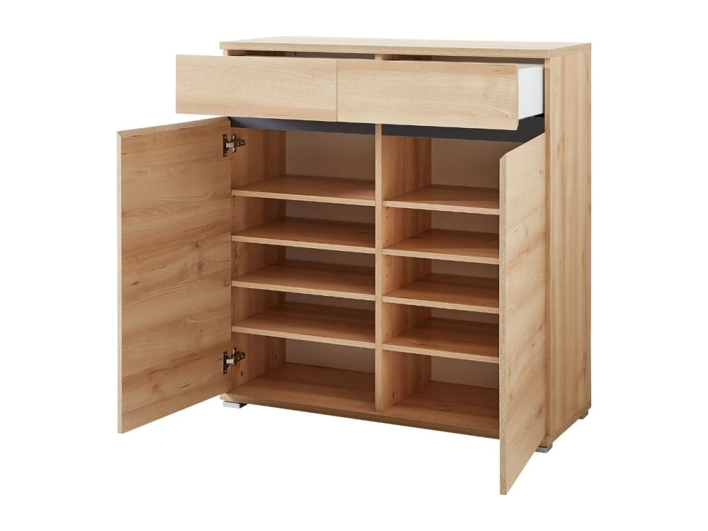 Botník Lissabon je vyhotoven v přírodním dekoru bukového dřeva. Vnitřní prostor je rozdělen mezi 2 zásuvky a 8 polic, které jsou nastavitelné. Police pojmou 20 párů obuvi. Botník má zabudované tlumiče dveří, které snižují opotřebení materiálu a vysoce kvalitní ABS hrany. Botník Lissabon bude skvěle ladit s ostatními kousky nábytku ze stejné kolekce nebo s dřevěnými prvky v moderním stylu.
