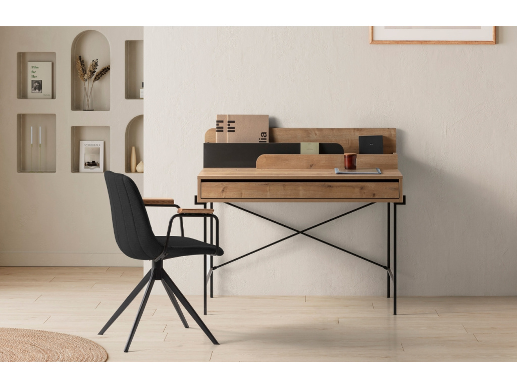 Židle Tali od značky Marckeric spojuje elegantní design s maximálním pohodlím, ať už ji využijete v domácí pracovně, kanceláři nebo zasedací místnosti. Otočná konstrukce s černě lakovanou kovovou podnoží zajišťující flexibilitu sofistikovaně ladí s pohodlným sedákem a opěrkou z černé texturované látky. Područky kombinující kov a překližku dodávají celku nápaditý kontrast a zároveň poskytují potřebnou oporu. Díky pečlivě vybraným materiálům a preciznímu zpracování je tato židle ideální volbou pro ty, kteří hledají spojení funkčnosti a estetiky.