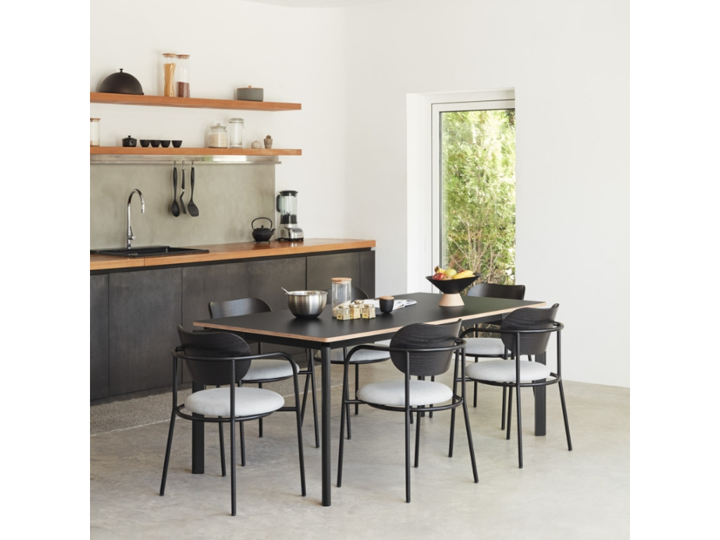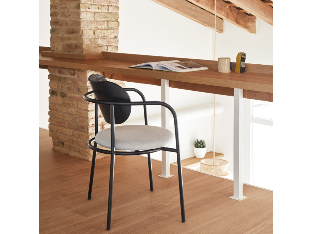 Jídelní židle Eclipse od značky Teulat nachází inspiraci v klasických designech kombinujících kovové a dřevěné prvky, které tvoří přímo ikonický vzhled. Příjemnou látkou čalouněný sedák a černé opěradlo s dřevěným dekorem jsou tvarované s ohledem na pohodlí během dlouhého sezení. Jde o elegantní a všestranný design, který krásně splyne s okolím ať už v koutku obývacího pokoje, kolem jídelního či zasedacího stolu v kanceláři nebo umístěný v hotelové hale.