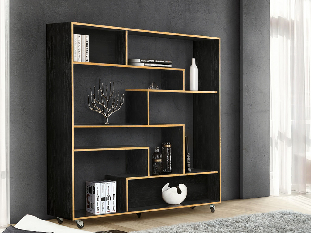Knihovna Southbury II. od značky Woodman nabízí praktický úložný prostor a poutavé provedení s nepravidelným uspořádáním polic. Úložný prostor komody je tvořen několika policemi. Pro snadné přemístění jsou ke knihovně přidaná kolečka. Jedna horní a jedna spodní police má také uzavřenou zadní část. Southbury si najde své místo v obývacím pokoji, jídelně i ložnici a díky nestárnoucímu spojení černé barvy a dřeva dodá interiéru nadčasový prvek.