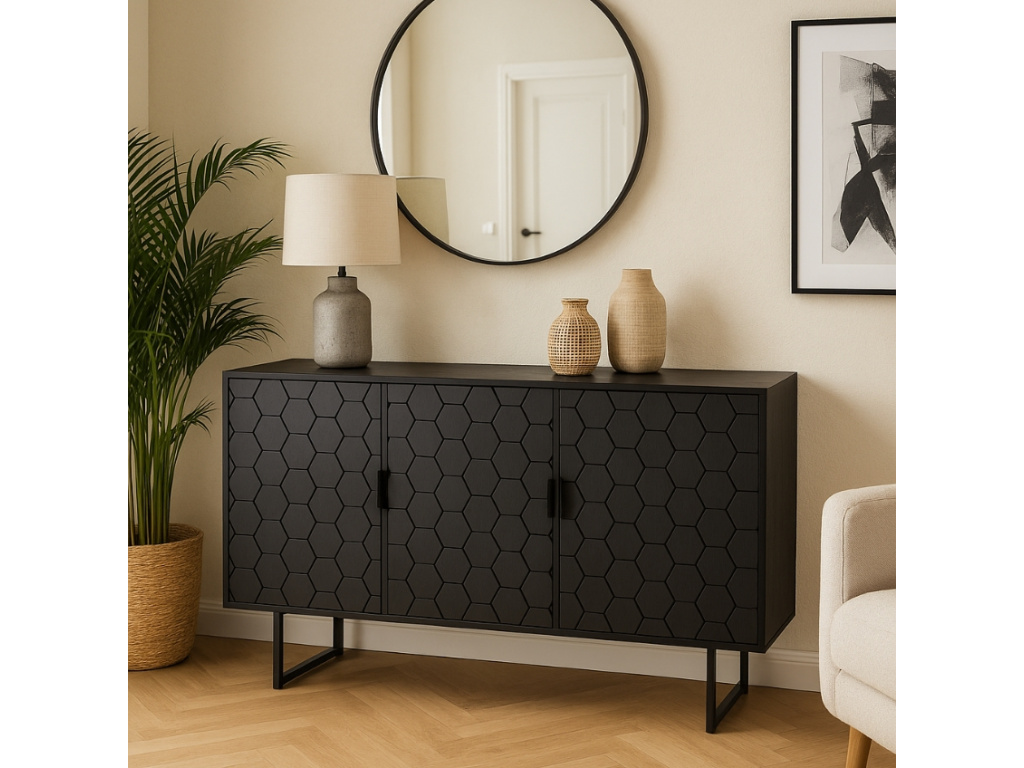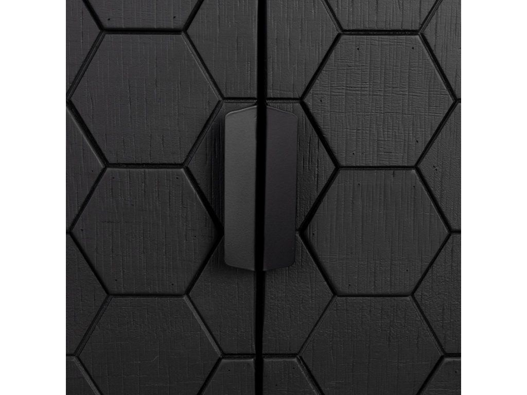 Obohaťte svoji domácnost komodou LINC od značky WLL. Tělo komody je vyrobeno z černého, jedlového dřeva, podnož je kovová a černě lakovaná. Přední stranu komody zdobí šestiúhelníkový dekor, který upoutá pozornost každého zvědavého páru očí. LINC poskytuje dostatek úložného prostoru, a to v podobě tří polic schovanými za dvířky. Komoda skvěle poslouží v obývacím pokoji, v ložnici, nebo v pracovně – umístěte do ní ložní prádlo, slavnostní nádobí, nebo důležité dokumenty. Záleží jen na vás. LINC bude vypadat fantasticky v industriálních a minimalistických interiérech. V nabídce máme také alternativní velikost komody – jaká velikost to bude?