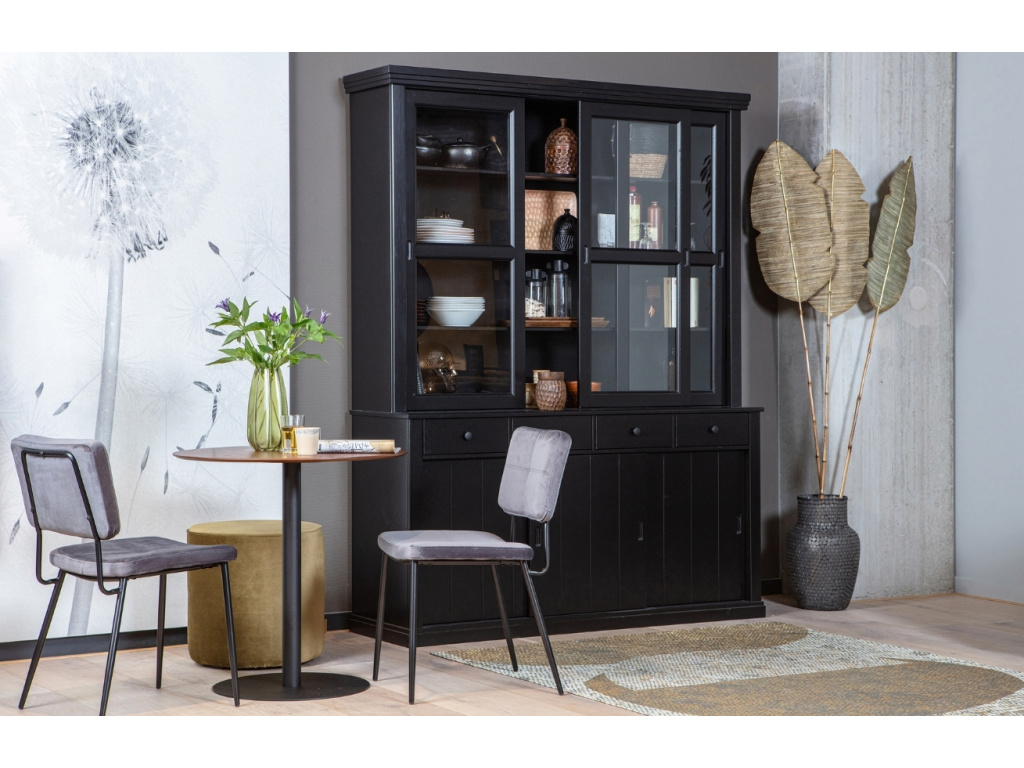 Také rádi vzpomínáte na prázdniny strávené u babičky na venkově? S rustikální vitrínou Ariel v černé barvě se vrátíte v čase! Překrásná vitrína, inspirovaná retro stylem, se stane designovým skvostem převážně interiérů v klasickém stylu, kterým dodá svěží nádech a styl. Vitrína disponuje čtyřmi zásuvkami a čtyřmi policemi schovanými za posuvnými dveřmi, díky čemuž nabízí dostatek úložného prostoru.