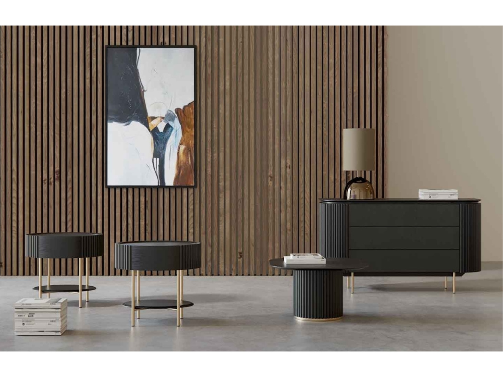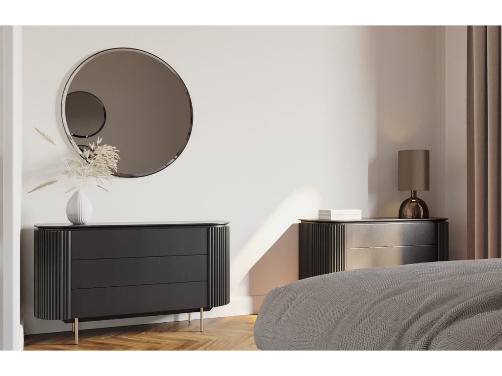 Nejen v ložnici se bude vyjímat elegantní komoda Fusano. Díky svému jedinečnému žebrovanému povrchu se stane neobvyklým prvkem vašeho interiéru. Kromě nadčasového designu komoda nabízí tři prostorné zásuvky, do kterých můžete uložit například spodní prádlo i větší oblečení. Komoda najde své místo v interiérech laděných do rustikálního stylu. Vrchní deska komody skvěle poslouží jako místo na designovou lampu i oblíbené dekorace, které ji stylově doplní. V interiéru jí můžete sladit s dalšími produkty se série Fusano – interiér tak bude vypadat famózně!