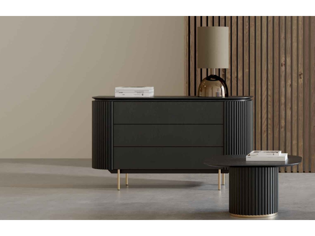 Nejen v ložnici se bude vyjímat elegantní komoda Fusano. Díky svému jedinečnému žebrovanému povrchu se stane neobvyklým prvkem vašeho interiéru. Kromě nadčasového designu komoda nabízí tři prostorné zásuvky, do kterých můžete uložit například spodní prádlo i větší oblečení. Komoda najde své místo v interiérech laděných do rustikálního stylu. Vrchní deska komody skvěle poslouží jako místo na designovou lampu i oblíbené dekorace, které ji stylově doplní. V interiéru jí můžete sladit s dalšími produkty se série Fusano – interiér tak bude vypadat famózně!