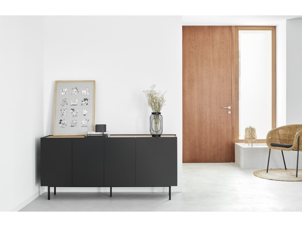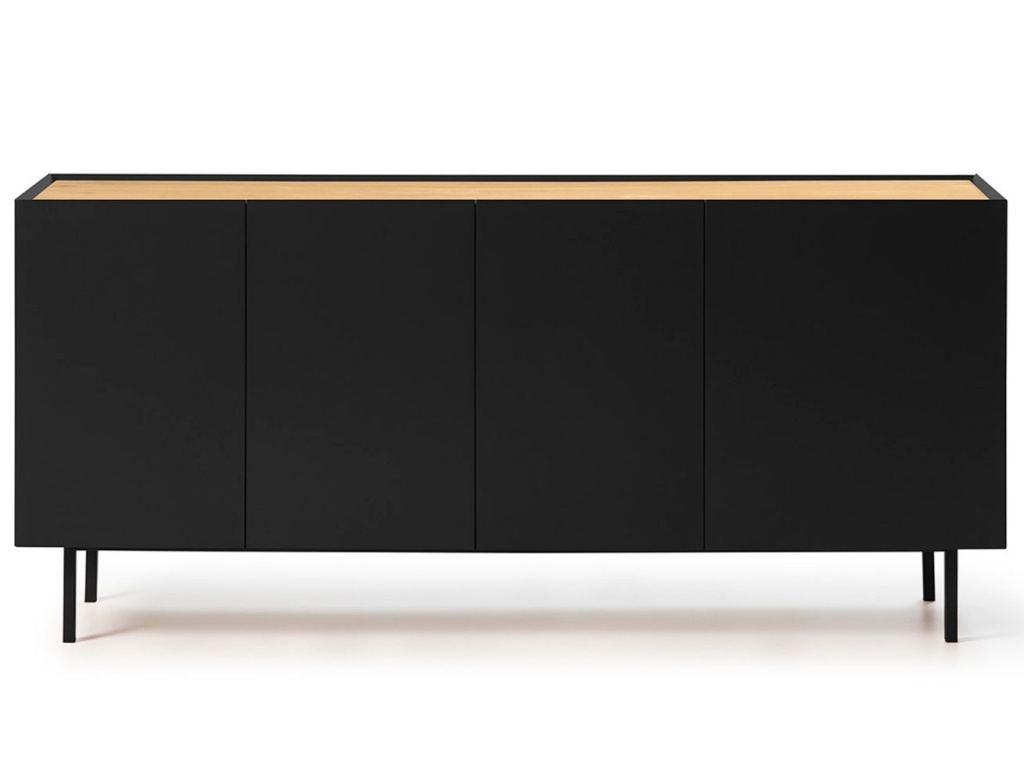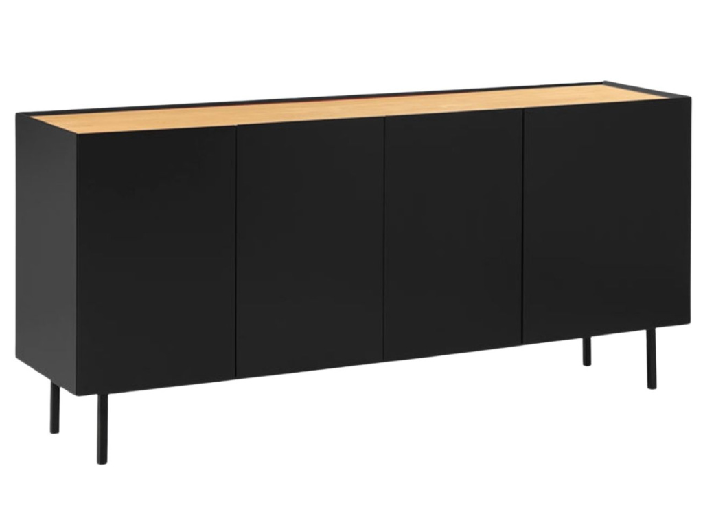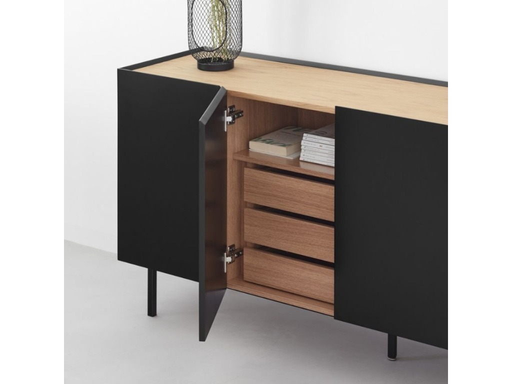 Komoda Teulat Arista bude stylovou ozdobou každého moderního interiéru obývacího pokoje i ložnice. Dominantní černá barva podtrhuje minimalistický design této komody, se kterým kontrastuje vrchní deska s dubovou dýhou v přírodním odstínu. Úložný prostor je prakticky rozčleněn do polic a výsuvných zásuvek, což vám bude ulehčovat organizaci vašeho inventáře. Moderní styl komody podtrhuje tenká lakovaná kovová podnož, která barevně ladí se zbytkem komody.