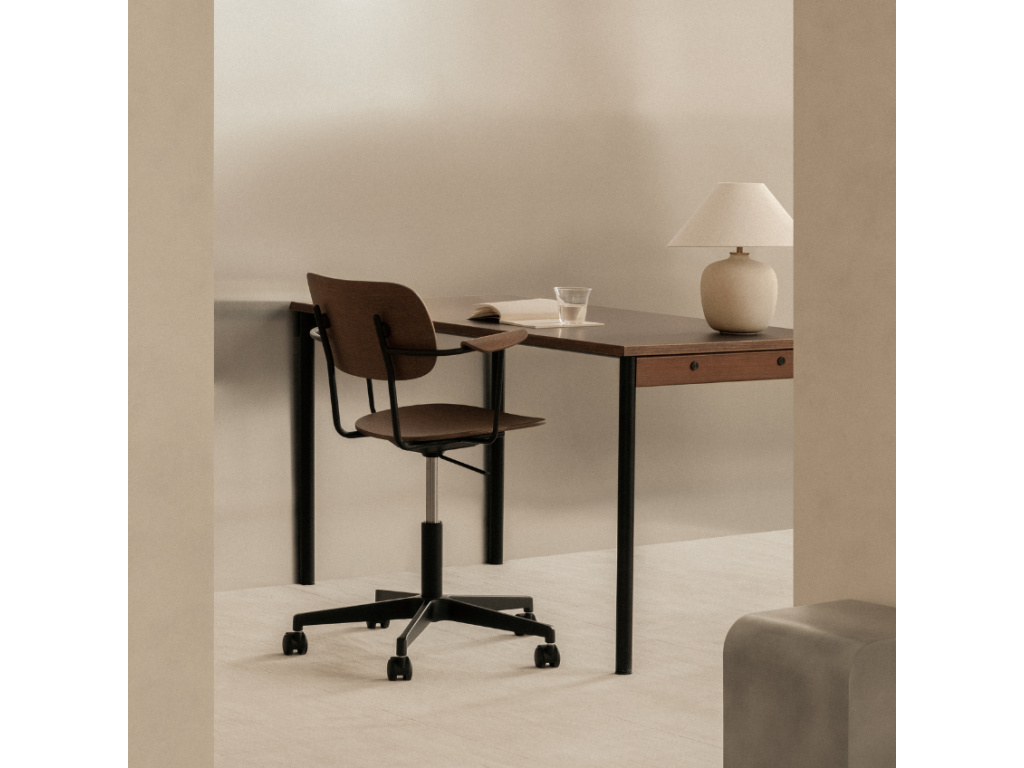 Usedněte do originální a stylové židle ze série CO od značky AUDO. Sedák, zádová opěrka i područky jsou vyrobeny z černé dubové překližky, kovová konstrukce spojující sedák, opěrku a područky je černě lakována. Pístovou podnož, kterou můžete libovolně polohovat díky páčce pod sedákem, doplňují kolečka, díky které můžete židli snadno přemisťovat po prostoru. Tuto designovku perfektně využijete jako židli k pracovnímu stolu. Díky dřevěným i kovovým prvkům židli dokonale sladíte s minimalistickým i industriálním interiérem. Vybrat si můžete mezi černou, hnědou a přírodní variantou dubového dřeva, černou nebo stříbrnou variantou kovových prvků anebo verzí bez područek – variabilita je klíčem ke vaší spokojenosti!
