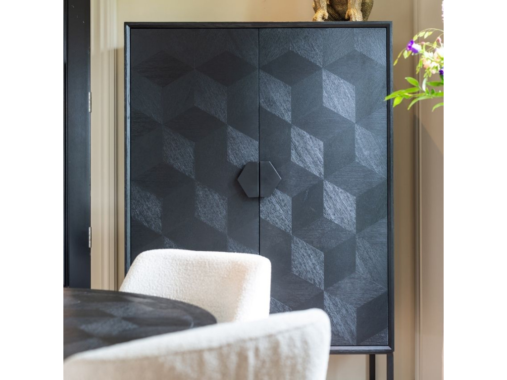 Černá skříň Blax od značky Richmond Interiors zaujme svým minimalismem a originálním zpracováním. Vyrobena je z černě lakovaného dubového dřeva, které doplňuje vyšší kovová podnož. Atraktivitu nábytku zvyšuje zajímavá mozaika na dveřích, za nimiž se ukrývá úložný prostor s třemi policemi. Díky čistému provedení a stylovému designu se skříň Blax stane designovou dominantou vašeho interiéru.