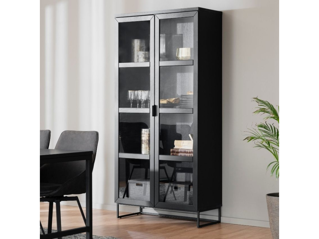 Prostorná vitrína ROWICO EVERETT působí velice elegantně a vzdušně. Je vyrobena z masivního černě lakovaného dubového dřeva a stojí na štíhlé kovové podnoži, které je také černě lakovaná. Použité dřevo je díky FSC certifikaci ekologicky šetrné a výroba vitríny tak nezatěžuje životní prostředí. Za dvěma prosklenými dvířky s nenápadnými kovovými úchytkami najdete čtyři prostorné police. Pokud toužíte po dokonale sjednoceném interiéru, můžete komodu doplnit dalšími produkty ze série EVERETT.