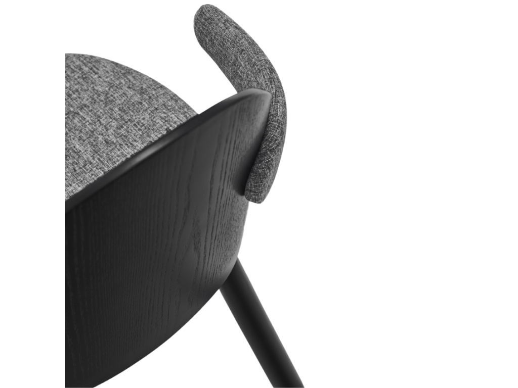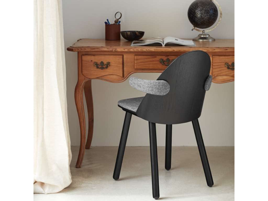 Teulat Uma je moderní jídelní židle v černé barvě, která je vhodná nejen do jídelních koutů a kuchyní, ale najde své uplatnění i ve veřejných prostorech různorodé funkce, kam vnese závan svěžího stylu. Design židle zaujme svými zaoblenými a minimalistickými tvary sedáku a pohodlných područek. Sedák židle je vyroben z jasanové překližky a podsedák i područky mají látkové čalounění. Stabilní podnož je z lakovaného masivního dřeva.