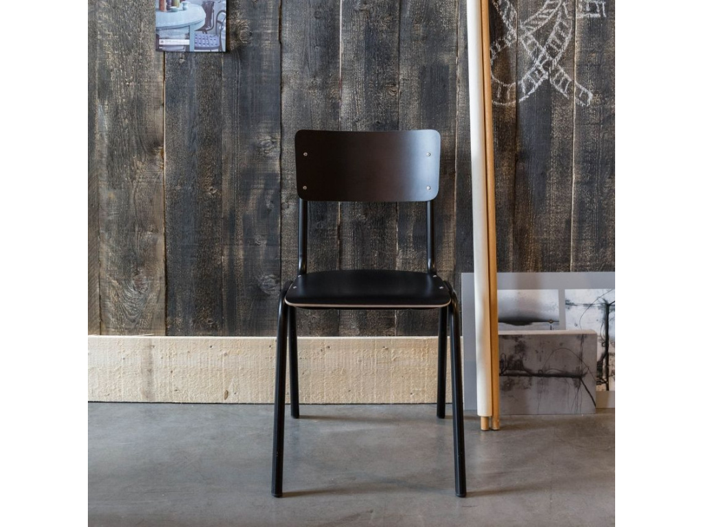 Modernizovaná židle ZUIVER BACK TO SCHOOL v černé barvě se sedákem a opěradlem z překližky pokryté slabým a vysokotlakým laminátem, díky kterému se tato stohovatelná židle vyznačuje vysokou pevností a odolností. Stabilitu celé židle pak zajišťuje pevná ocelová podnož v černém provedení.