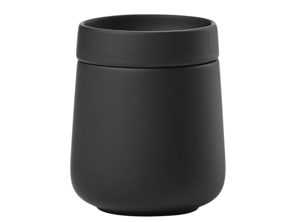 Uzavíratelná dóza do koupelny Nova One od dánské značky Zone Denmark esteticky skryje menší předměty a ochrání je před vlhkostí. Designový box se skládá z minimalistického kelímku a prohloubeného víka, které může sloužit i jako malá miska. Potěší vás jistě také pevný a odolný materiál z matné kameniny v černé barvě. Koupelnovou dózu s víkem můžete využít například jako zásobník na vatové tyčinky nebo odličovací tampony. Vybírejte až ze sedmi barevných variant.