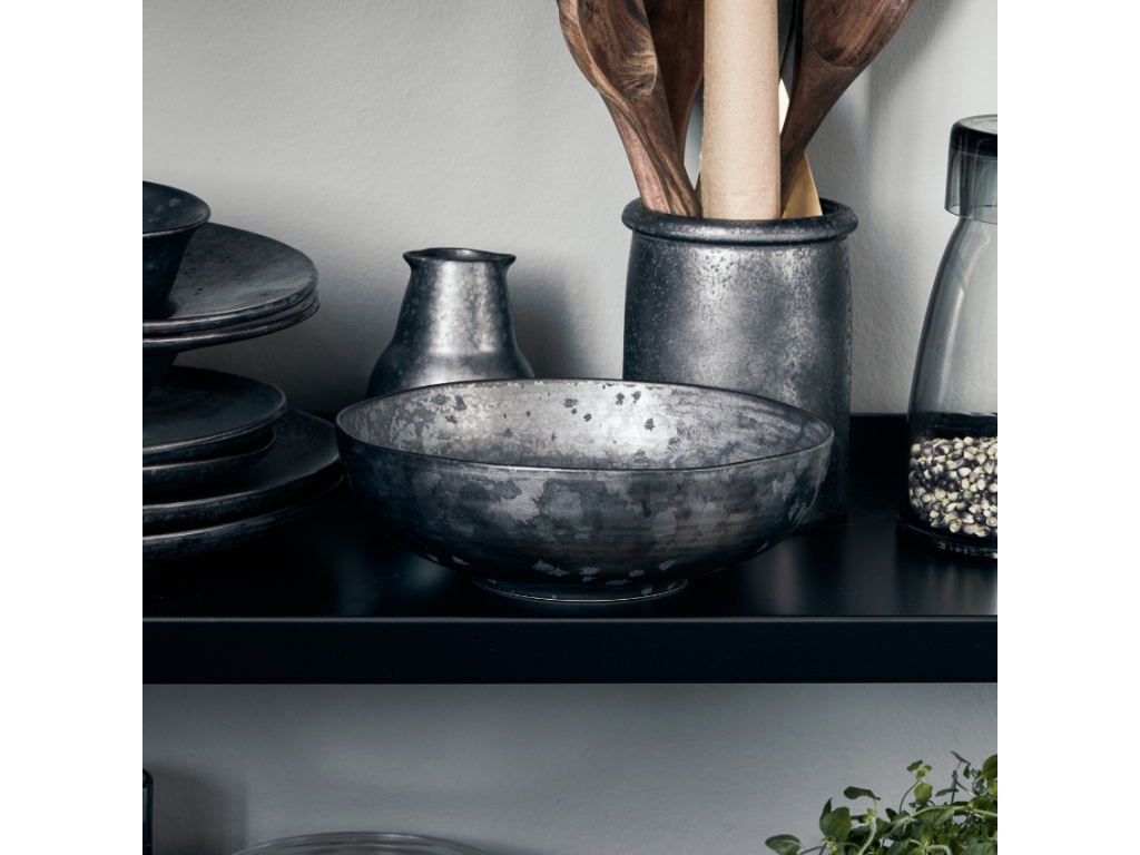 Kameninová miska Pion s průměrem 22 cm je navržena tak, aby byla co nejpraktičtějším nádobím ve vaší kuchyni. Jednoduchý vzhled v matně černé glazuře je ozvláštněn efektem připomínající oxidování kovu. Je vhodná pro formální i neformální stolování, ozdobí stůl na rodinné oslavě nebo při zahradním grilování s přáteli. Lze ji využívat jako misku na ovoce, suché či sypké potraviny, ale také jako hluboký talíř na polévku a hlavní chod, takže je skutečně všestranným pomocníkem. Doplnit ji můžete o další nádobí z řady Pion – dohromady vytvoří stylový jídelní set.
