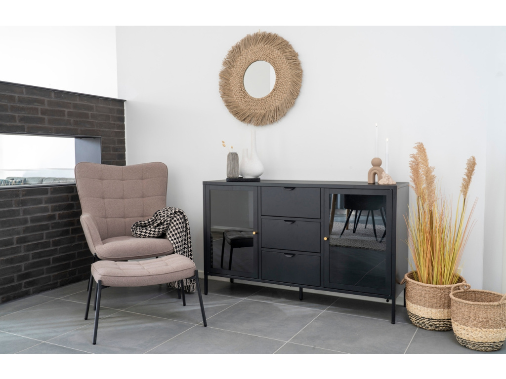 Dobby se stane elegantním a nanejvýš praktickým společníkem v obývacím pokoji, kuchyni či pracovně. Za skleněnými dvířky najdete dohromady čtyři police, které nabízí dostatek úložného prostoru pro přehledné uložení a vystavení knih, časopisů a dekorativních předmětů na dosah ruky. K dispozici jsou také tři zásuvky. Konstrukce z oceli zajišťuje dlouhou životnost a také snadnou údržbu. Komoda má klasický design, který ale doplní celou řadu interiérů.