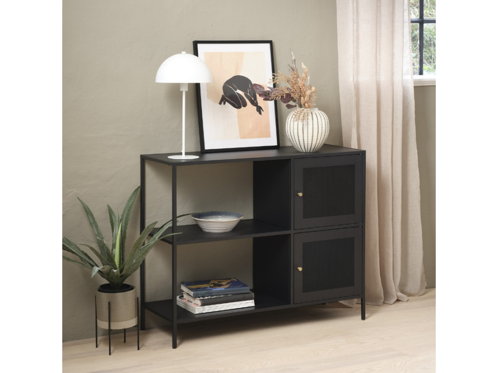 Kovová komoda Carmel od značky Unique Furniture představuje jednoduchý design, styl a praktičnost v jednom kousku. Konstrukce z černě lakovaného kovu zajišťuje dlouhou životnost a také snadnou údržbu. Dominantním a zajímavým prvkem jsou černě lakovaná perforovaná dvířka, za kterými se ukrývá úložný prostor v podobě dvou polic. Součástí komody jsou také 2 otevřené police pro přehledné uložení a vystavení knih, časopisů či dekorativních předmětů. Dvířka jsou ozdobena drobnými zlatými či černými úchytkami, které zvolíte je jen na vás. Komodu Malibu nabízíme ve dvou variantách a můžete ji sladit s dalšími produkty ze stejnojmenné řady.