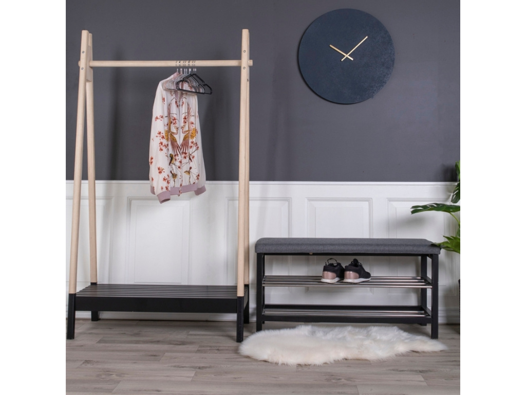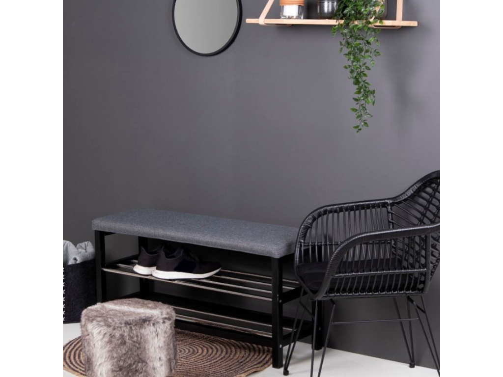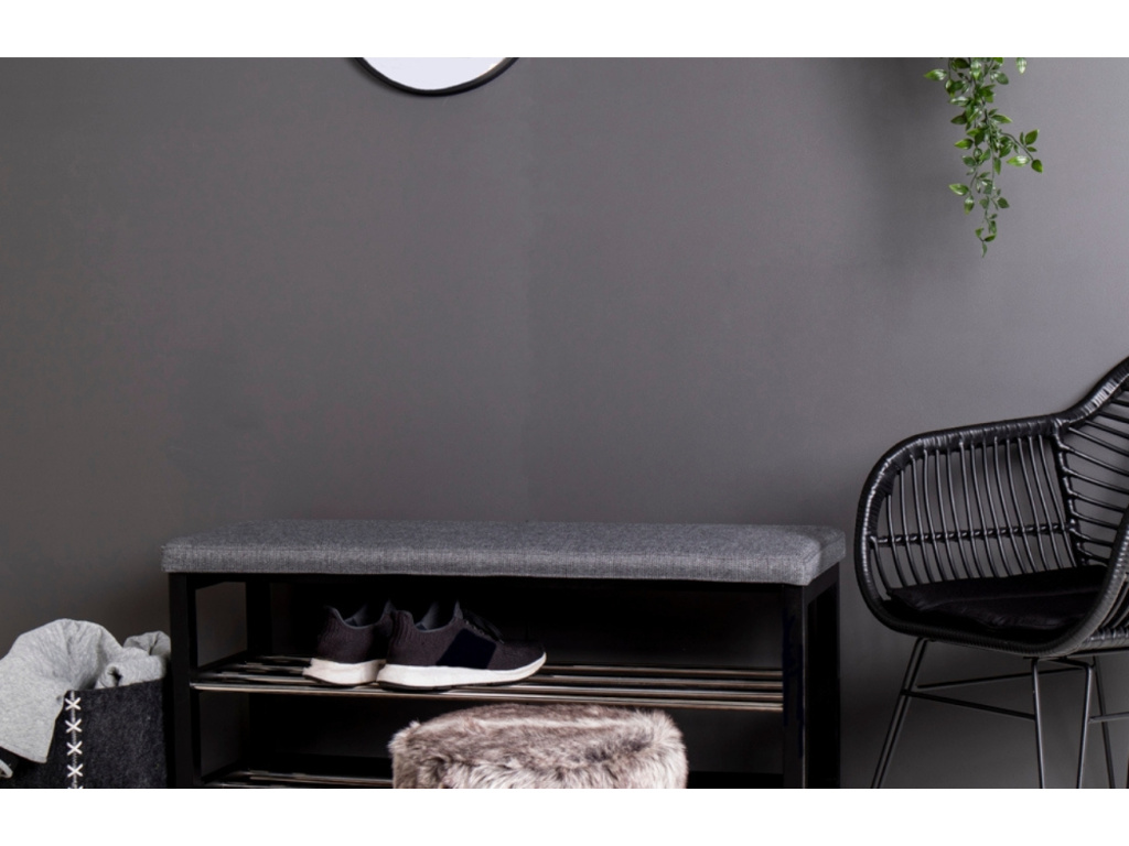 S Fintan získáte lavici a botník v jednom. Měkký látkový podsedák je v šedé barvě a skvěle ladí s černou podnoží z topolového dřeva. Boty můžete lehce uklidit na dvě kovové police vytvořené z tyčí. Fitan zapadne zejména do moderně zařízeného interiéru, kde se stane praktickým pomocníkem.
