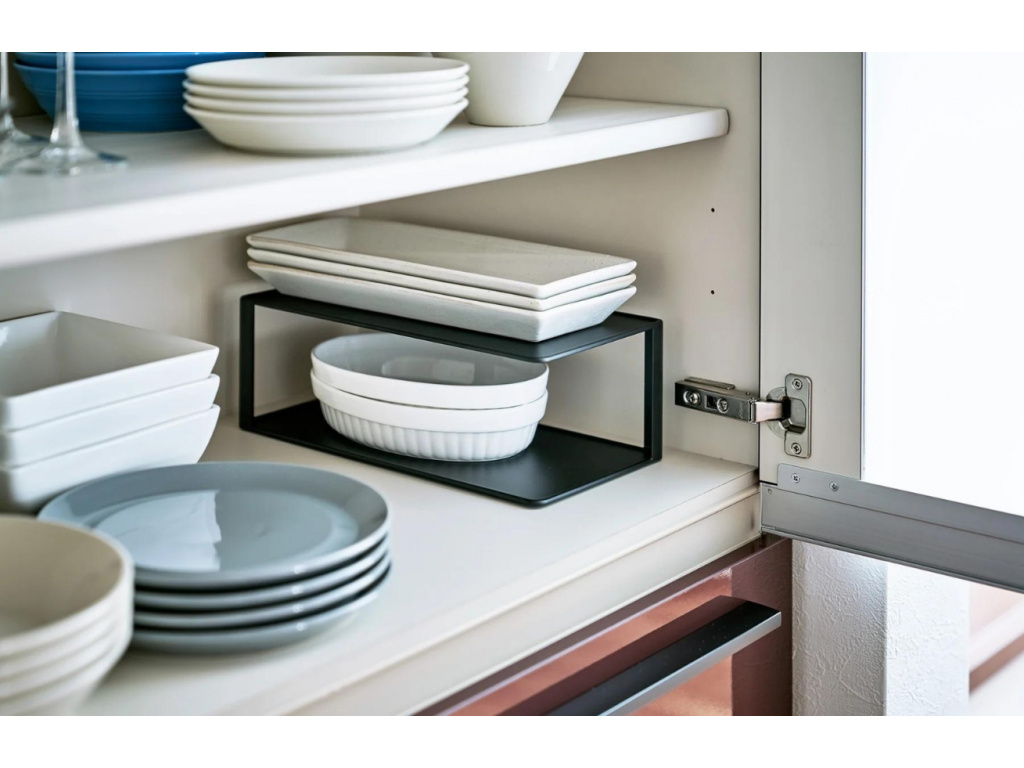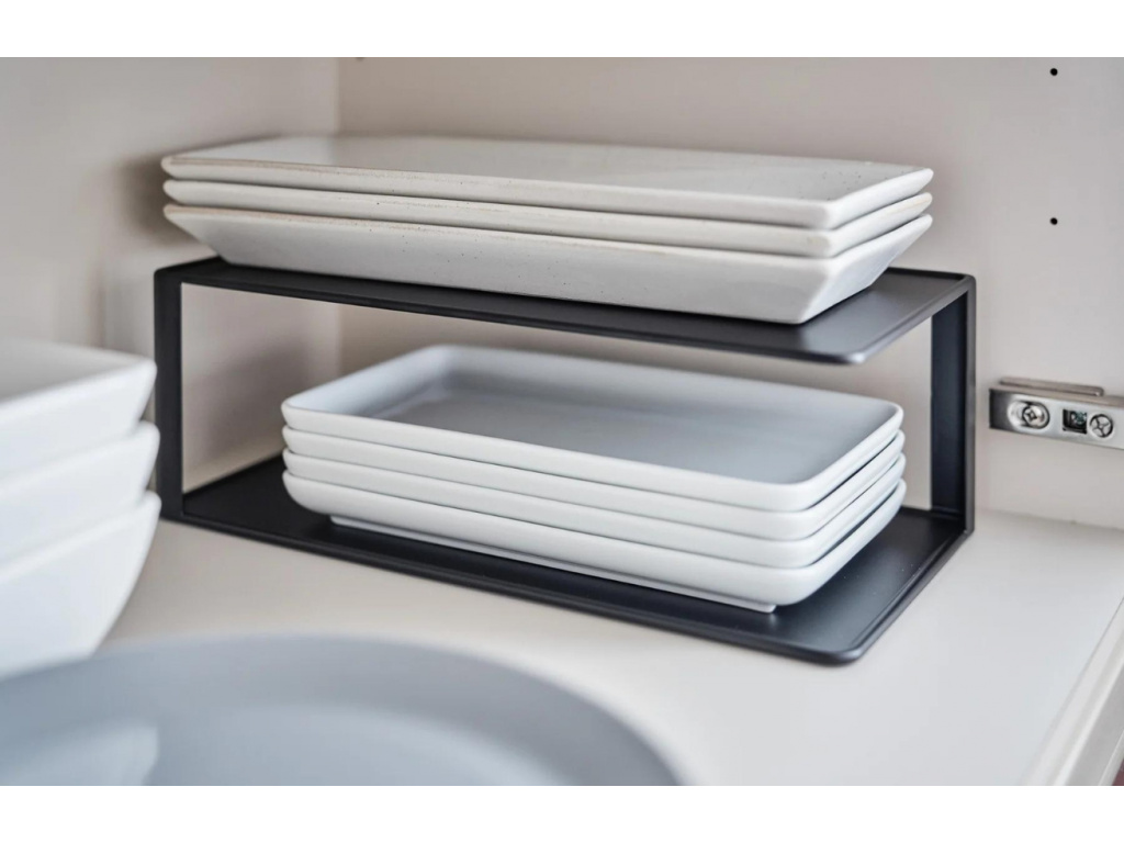 Přídavná police Tower od značky Yamazaki je skvělým řešením pro každou kuchyň, která potřebuje více úložného prostoru a lepší organizaci. Polička je vyrobena z černě lakovaného kovu, což zajišťuje její pevnost, stabilitu a dlouhou životnost. Nápaditý tvar bez rohové stojny usnadňuje manipulaci s nádobím a zajišťuje snadný přístup ke všem uloženým předmětům. Lze na ni umístit talíře, misky, hrnky, kořenky nebo jiné kuchyňské potřeby. Polička je univerzální a může být použita nejen v kuchyni, ale také v jiných částech domácnosti, například v koupelně, pracovně nebo obývacím pokoji, kde může sloužit k uspořádání různých předmětů.