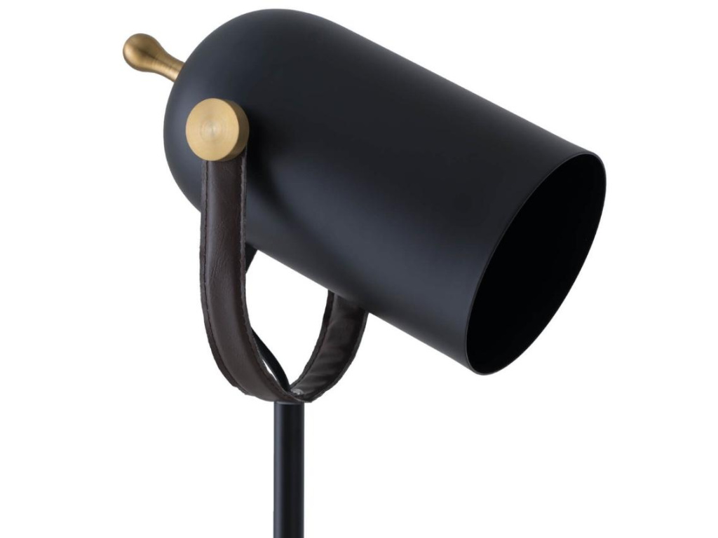 Designová lampa Somcasa Nacia je moderním a jednoduchým prvkem do každého interiéru. Černá kovová noha a stínidlo jsou velmi elegantní a doplní vaši kancelář nebo obývací pokoj. Zlaté detaily dodávají lampě luxusní vzhled a koženka v horní části dodává jedinečnost.